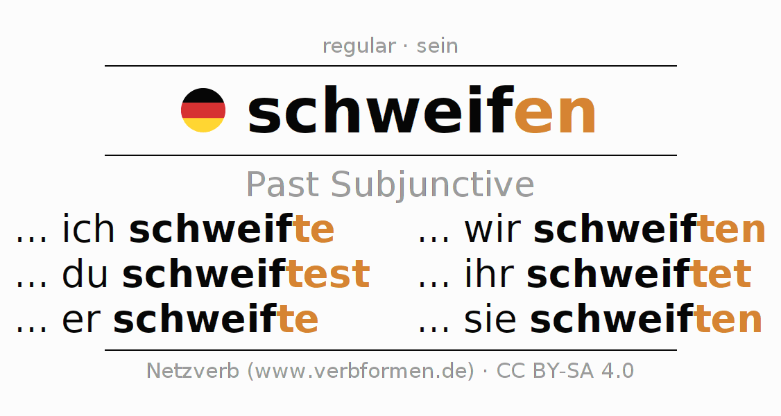 The conjugation of schweifen in Subjunctive Imperfect Form of possibility Active is ... ich schweifte, ... du schweiftest, ... er schweifte, ... wir schweiften, ... ihr schweiftet, ... sie schweiften.The conjugation corresponds to certain grammatical rules. Likewise the requirements for the conjugation of the simple verb forms of schweifen in Imperfect Subjunctive. Comments ☆