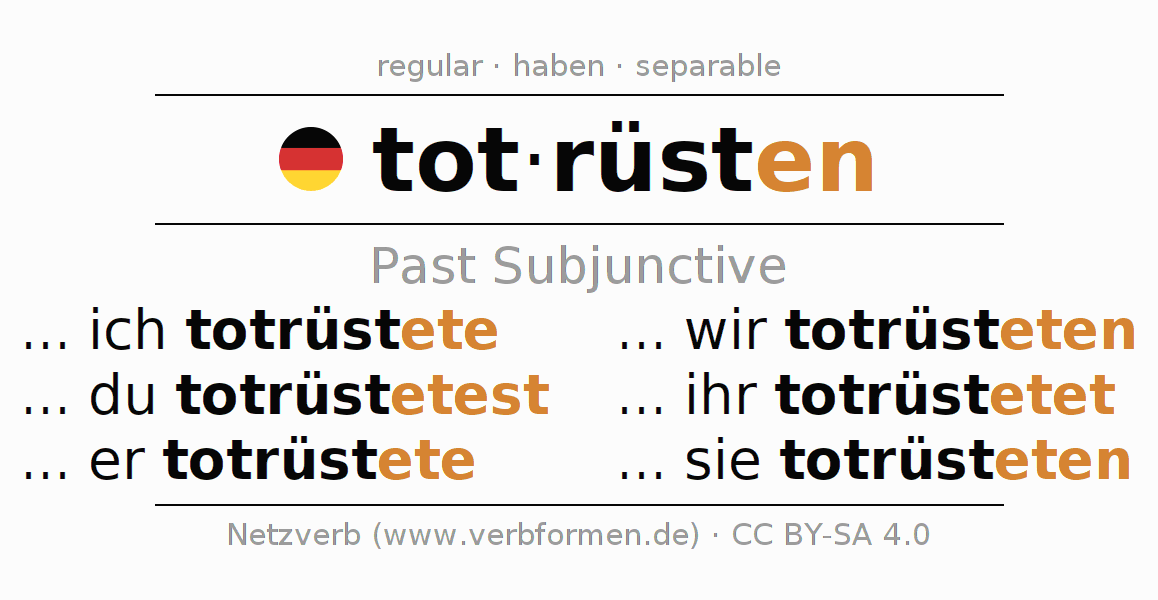 The conjugation of totrüsten in Subjunctive Imperfect Form of possibility Active is ... ich totrüstete, ... du totrüstetest, ... er totrüstete, ... wir totrüsteten, ... ihr totrüstetet, ... sie totrüsteten.The conjugation corresponds to certain grammatical rules. Likewise the requirements for the conjugation of the simple verb forms of totrüsten in Imperfect Subjunctive. Comments ☆