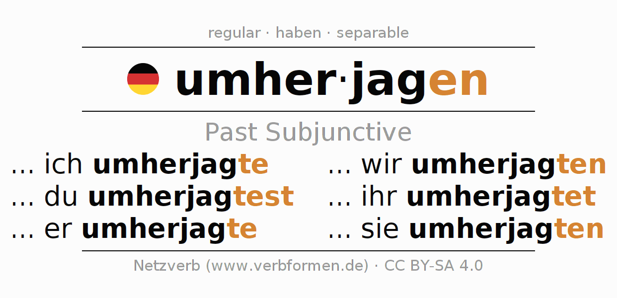 The conjugation of umherjagen in Subjunctive Imperfect Form of possibility Active is ... ich umherjagte, ... du umherjagtest, ... er umherjagte, ... wir umherjagten, ... ihr umherjagtet, ... sie umherjagten.The conjugation corresponds to certain grammatical rules. Likewise the requirements for the conjugation of the simple verb forms of umherjagen in Imperfect Subjunctive. Comments ☆