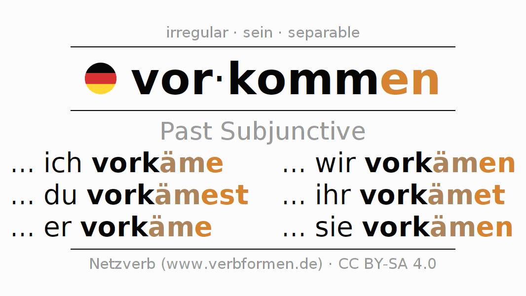 The conjugation of vorkommen in Subjunctive Imperfect Form of possibility Active is ... ich vorkäme, ... du vorkämest, ... er vorkäme, ... wir vorkämen, ... ihr vorkämet, ... sie vorkämen.The conjugation corresponds to certain grammatical rules. Likewise the requirements for the conjugation of the simple verb forms of vorkommen in Imperfect Subjunctive. Comments ☆
