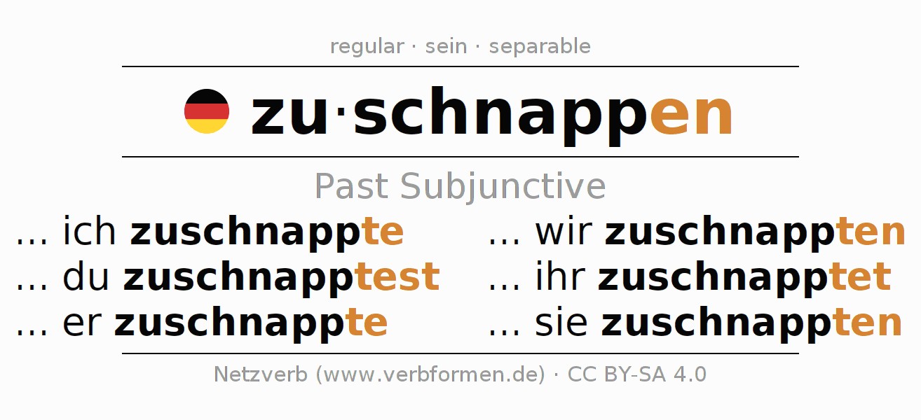 The verb zuschnappen (ist) fully conjugated in all persons and numbers in the Subjunctive Imperfect