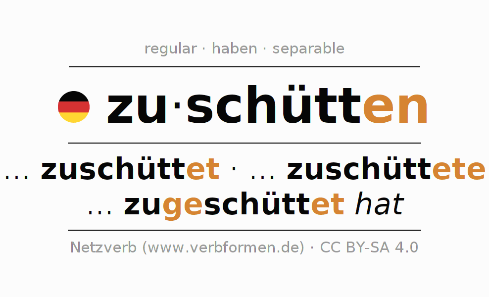 The conjugation of zuschütten in Subjunctive Imperfect Form of possibility Active is ... ich zuschüttete, ... du zuschüttetest, ... er zuschüttete, ... wir zuschütteten, ... ihr zuschüttetet, ... sie zuschütteten.The conjugation corresponds to certain grammatical rules. Likewise the requirements for the conjugation of the simple verb forms of zuschütten in Imperfect Subjunctive. Comments ☆