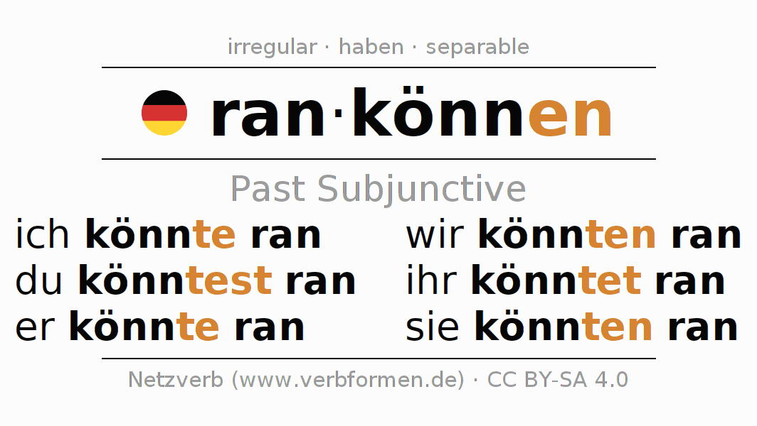 The conjugation of rankönnen (approach, be able to approach) in subjunctive II is: ich könnte ran, du könntest ran, er könnte ran, wir könnten ran, ihr könntet ran, sie könnten ran. As an irregular verb is the changed subjunctive stem könn- used. The subjunctive endings -te, -test, -te, -ten, -tet, -ten are appended to this stem. The prefix ran- of rankönnen is separated. The conjugation of these forms conforms to the grammatical rules for verbs in the subjunctive II tense.