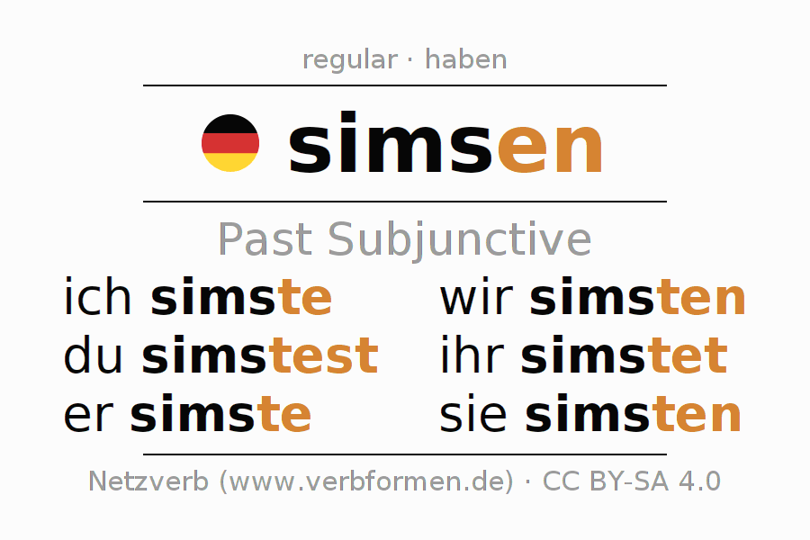 The conjugation of simsen (text, SMS) in subjunctive II is: ich simste, du simstest, er simste, wir simsten, ihr simstet, sie simsten. As a regular verb the unmodified stem sims is used. The subjunctive endings -te, -test, -te, -ten, -tet, -ten are appended to this stem. The conjugation of these forms conforms to the grammatical rules for verbs in the subjunctive II tense.
