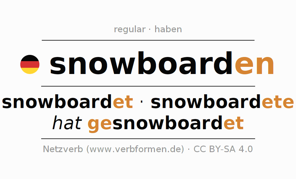 The conjugation of snowboarden (snowboarding, snowbord) in subjunctive II is: ich snowboardete, du snowboardetest, er snowboardete, wir snowboardeten, ihr snowboardetet, sie snowboardeten. As a regular verb the unmodified stem snowboard is used. The subjunctive endings -ete, -etest, -ete, -eten, -etet, -eten are appended to this stem. The endings are extended by "e", as the stem ends on -d. The conjugation of these forms conforms to the grammatical rules for verbs in the subjunctive II tense.