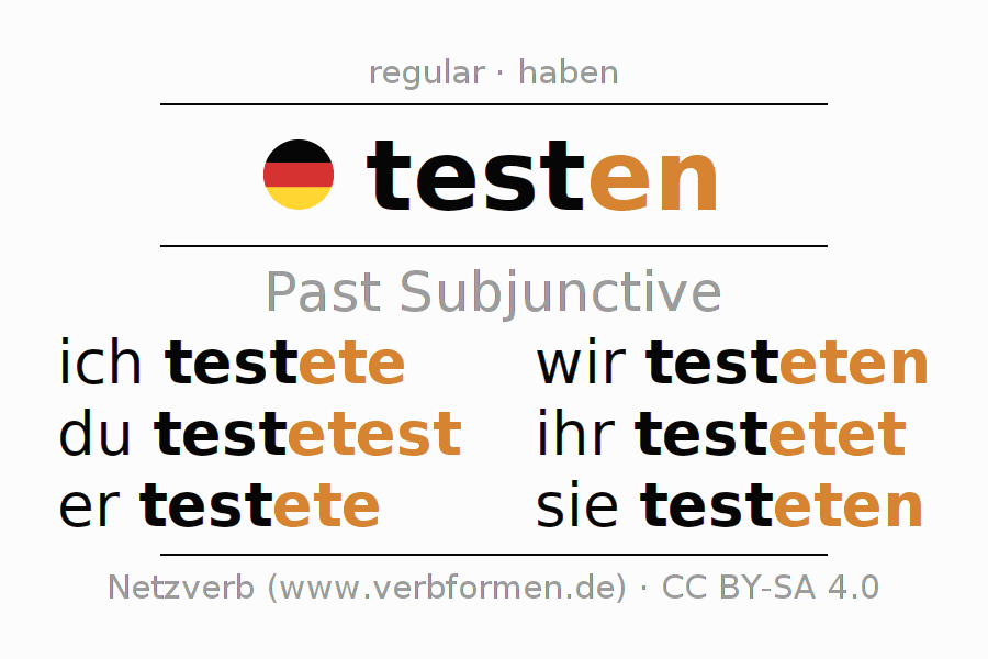 The conjugation of testen (check, test) in subjunctive II is: ich testete, du testetest, er testete, wir testeten, ihr testetet, sie testeten. As a regular verb the unmodified stem test is used. The subjunctive endings -ete, -etest, -ete, -eten, -etet, -eten are appended to this stem. The endings are extended by "e", as the stem ends on -t. The conjugation of these forms conforms to the grammatical rules for verbs in the subjunctive II tense.
