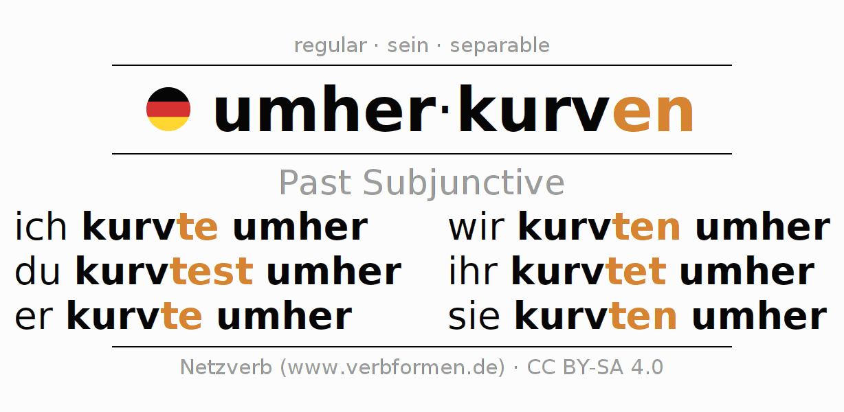 The conjugation of umherkurven (cruise, drive around) in subjunctive II is: ich kurvte umher, du kurvtest umher, er kurvte umher, wir kurvten umher, ihr kurvtet umher, sie kurvten umher. As a regular verb the unmodified stem kurv is used. The subjunctive endings -te, -test, -te, -ten, -tet, -ten are appended to this stem. The prefix umher- of umherkurven is separated. The conjugation of these forms conforms to the grammatical rules for verbs in the subjunctive II tense.