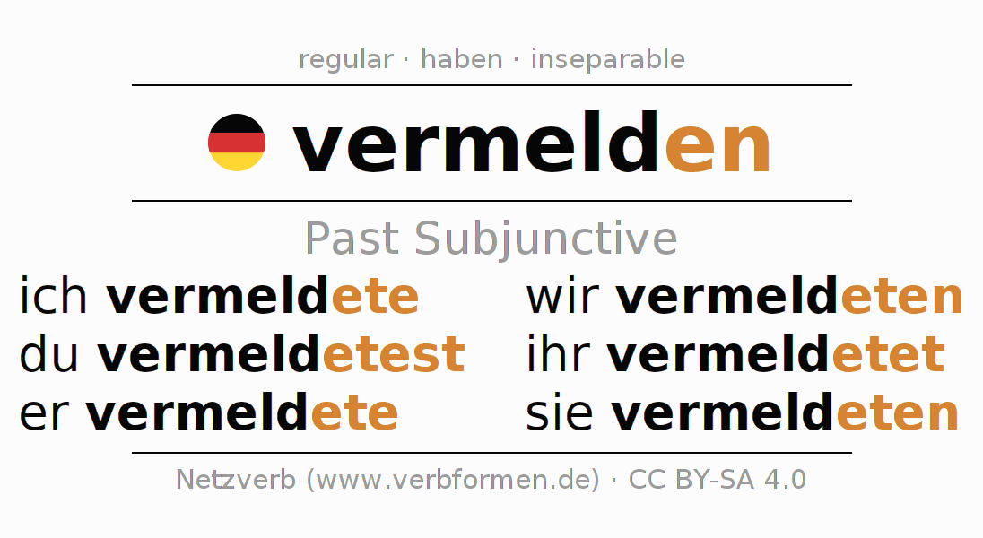 The conjugation of vermelden (announce, report) in subjunctive II is: ich vermeldete, du vermeldetest, er vermeldete, wir vermeldeten, ihr vermeldetet, sie vermeldeten. As a regular verb the unmodified stem meld is used. The subjunctive endings -ete, -etest, -ete, -eten, -etet, -eten are appended to this stem. The endings are extended by "e", as the stem ends on -d. The conjugation of these forms conforms to the grammatical rules for verbs in the subjunctive II tense.