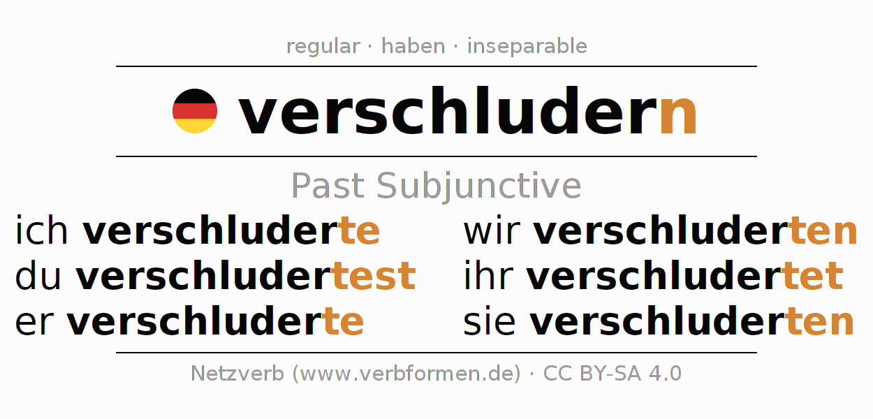 The conjugation of verschludern (neglect, overlook) in subjunctive II is: ich verschluderte, du verschludertest, er verschluderte, wir verschluderten, ihr verschludertet, sie verschluderten. As a regular verb the unmodified stem schluder is used. The subjunctive endings -te, -test, -te, -ten, -tet, -ten are appended to this stem. The conjugation of these forms conforms to the grammatical rules for verbs in the subjunctive II tense.