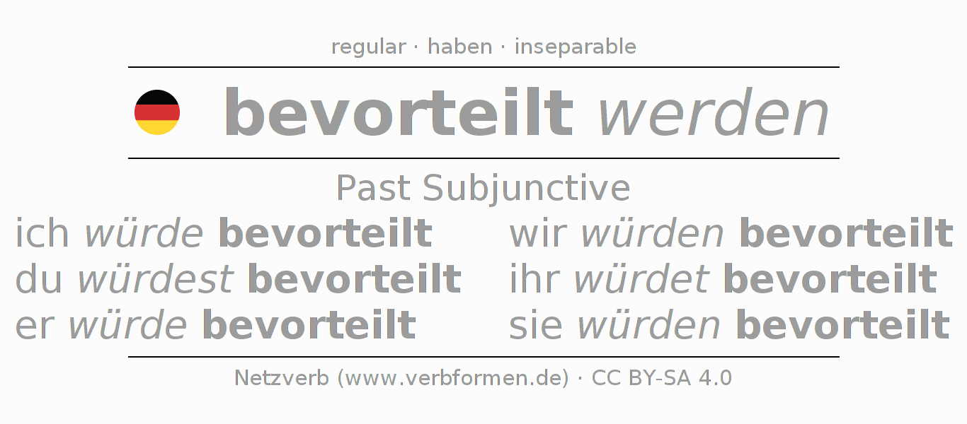 The conjugation of bevorteilen in Subjunctive Imperfect Form of possibility Passive is ich würde bevorteilt, du würdest bevorteilt, er würde bevorteilt, wir würden bevorteilt, ihr würdet bevorteilt, sie würden bevorteilt.The conjugation corresponds to certain grammatical rules. Likewise the requirements for the conjugation of the simple verb forms of bevorteilen in Imperfect Subjunctive. Comments ☆