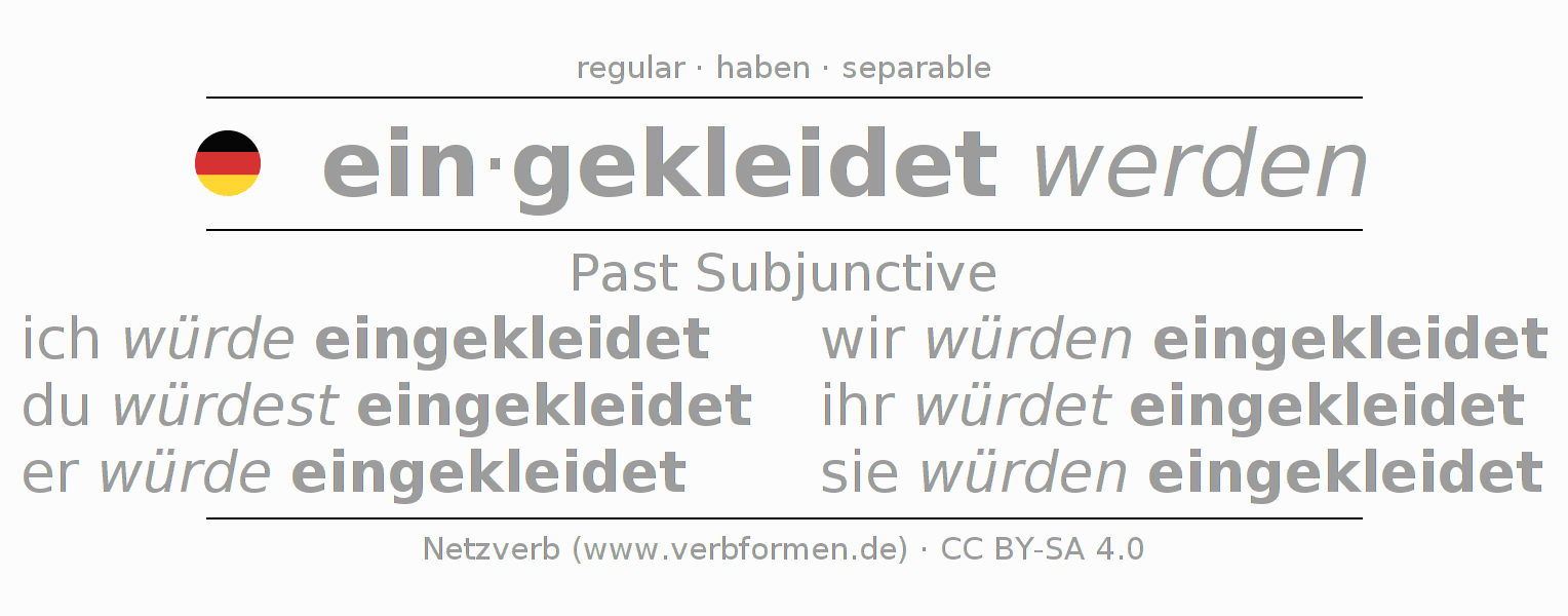 The conjugation of einkleiden in Subjunctive Imperfect Form of possibility Passive is ich würde eingekleidet, du würdest eingekleidet, er würde eingekleidet, wir würden eingekleidet, ihr würdet eingekleidet, sie würden eingekleidet.The conjugation corresponds to certain grammatical rules. Likewise the requirements for the conjugation of the simple verb forms of einkleiden in Imperfect Subjunctive. Comments ☆