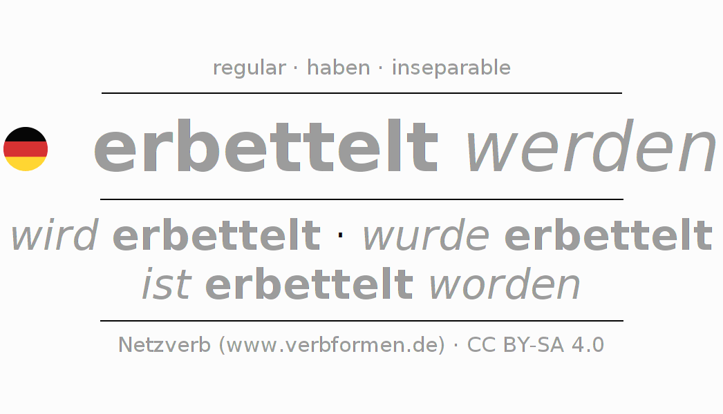 The conjugation of erbetteln in Subjunctive Imperfect Form of possibility Passive is ich würde erbettelt, du würdest erbettelt, er würde erbettelt, wir würden erbettelt, ihr würdet erbettelt, sie würden erbettelt.The conjugation corresponds to certain grammatical rules. Likewise the requirements for the conjugation of the simple verb forms of erbetteln in Imperfect Subjunctive. Comments ☆