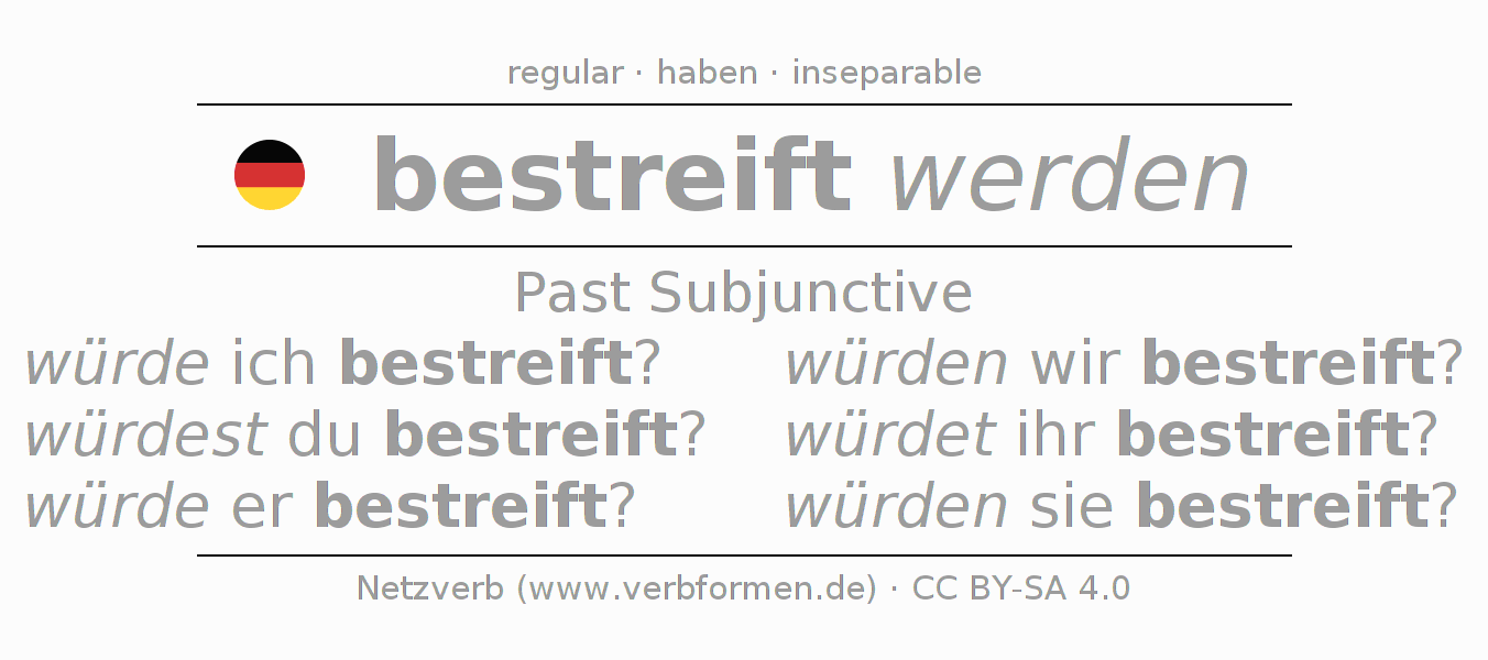 The conjugation of bestreifen in Subjunctive Imperfect Form of possibility Passive is würde ich bestreift?, würdest du bestreift?, würde er bestreift?, würden wir bestreift?, würdet ihr bestreift?, würden sie bestreift?.The conjugation corresponds to certain grammatical rules. Likewise the requirements for the conjugation of the simple verb forms of bestreifen in Imperfect Subjunctive. Comments ☆