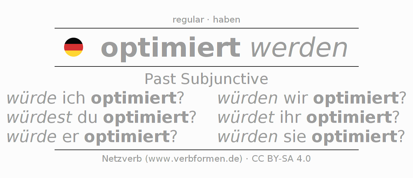 The conjugation of optimieren in Subjunctive Imperfect Form of possibility Passive is würde ich optimiert?, würdest du optimiert?, würde er optimiert?, würden wir optimiert?, würdet ihr optimiert?, würden sie optimiert?.The conjugation corresponds to certain grammatical rules. Likewise the requirements for the conjugation of the simple verb forms of optimieren in Imperfect Subjunctive. Comments ☆