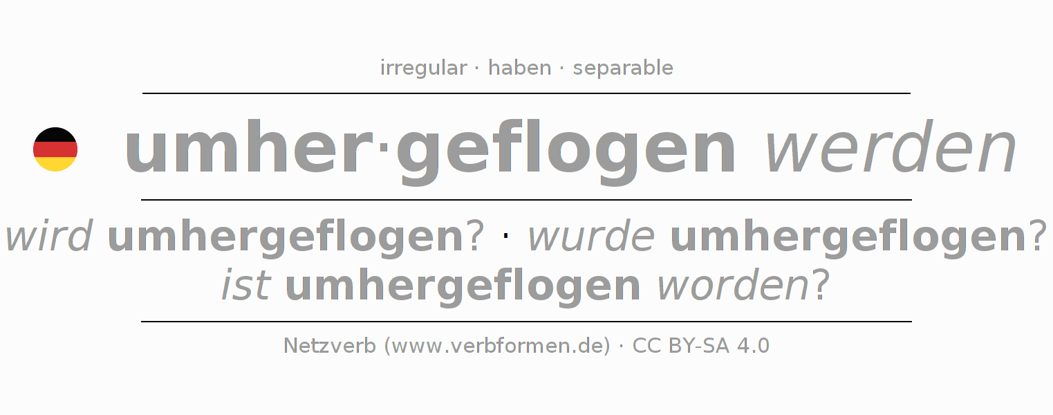 The conjugation of umherfliegen in Subjunctive Imperfect Form of possibility Passive is würde ich umhergeflogen?, würdest du umhergeflogen?, würde er umhergeflogen?, würden wir umhergeflogen?, würdet ihr umhergeflogen?, würden sie umhergeflogen?.The conjugation corresponds to certain grammatical rules. Likewise the requirements for the conjugation of the simple verb forms of umherfliegen in Imperfect Subjunctive. Comments ☆