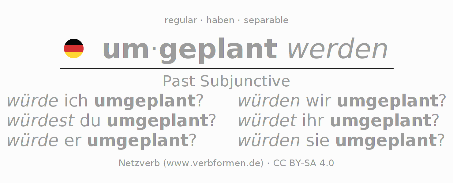 The conjugation of umplanen in Subjunctive Imperfect Form of possibility Passive is würde ich umgeplant?, würdest du umgeplant?, würde er umgeplant?, würden wir umgeplant?, würdet ihr umgeplant?, würden sie umgeplant?.The conjugation corresponds to certain grammatical rules. Likewise the requirements for the conjugation of the simple verb forms of umplanen in Imperfect Subjunctive. Comments ☆