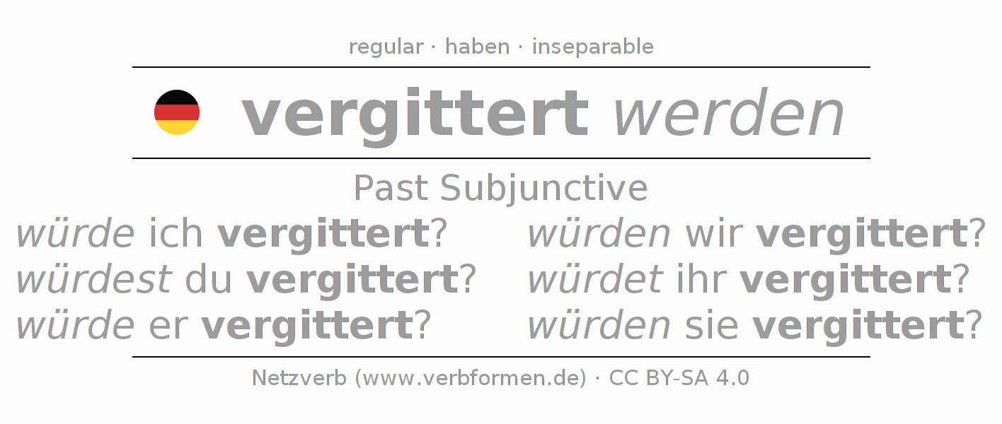 The conjugation of vergittern in Subjunctive Imperfect Form of possibility Passive is würde ich vergittert?, würdest du vergittert?, würde er vergittert?, würden wir vergittert?, würdet ihr vergittert?, würden sie vergittert?.The conjugation corresponds to certain grammatical rules. Likewise the requirements for the conjugation of the simple verb forms of vergittern in Imperfect Subjunctive. Comments ☆