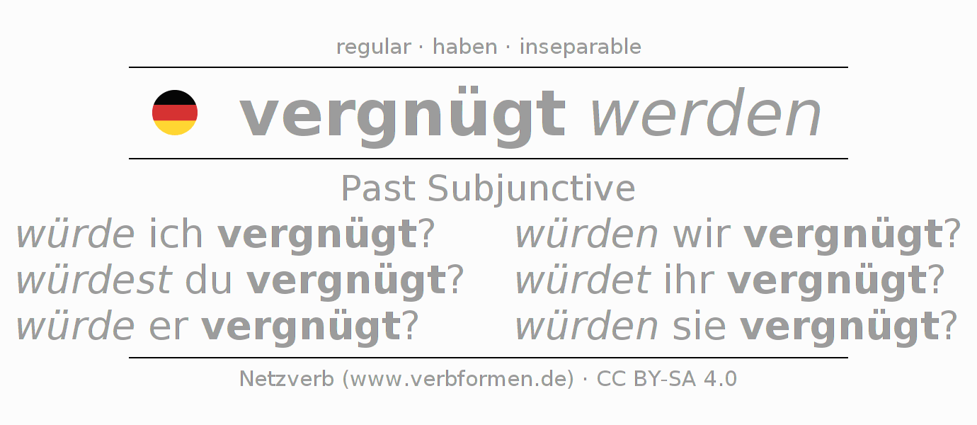 The conjugation of vergnügen in Subjunctive Imperfect Form of possibility Passive is würde ich vergnügt?, würdest du vergnügt?, würde er vergnügt?, würden wir vergnügt?, würdet ihr vergnügt?, würden sie vergnügt?.The conjugation corresponds to certain grammatical rules. Likewise the requirements for the conjugation of the simple verb forms of vergnügen in Imperfect Subjunctive. Comments ☆