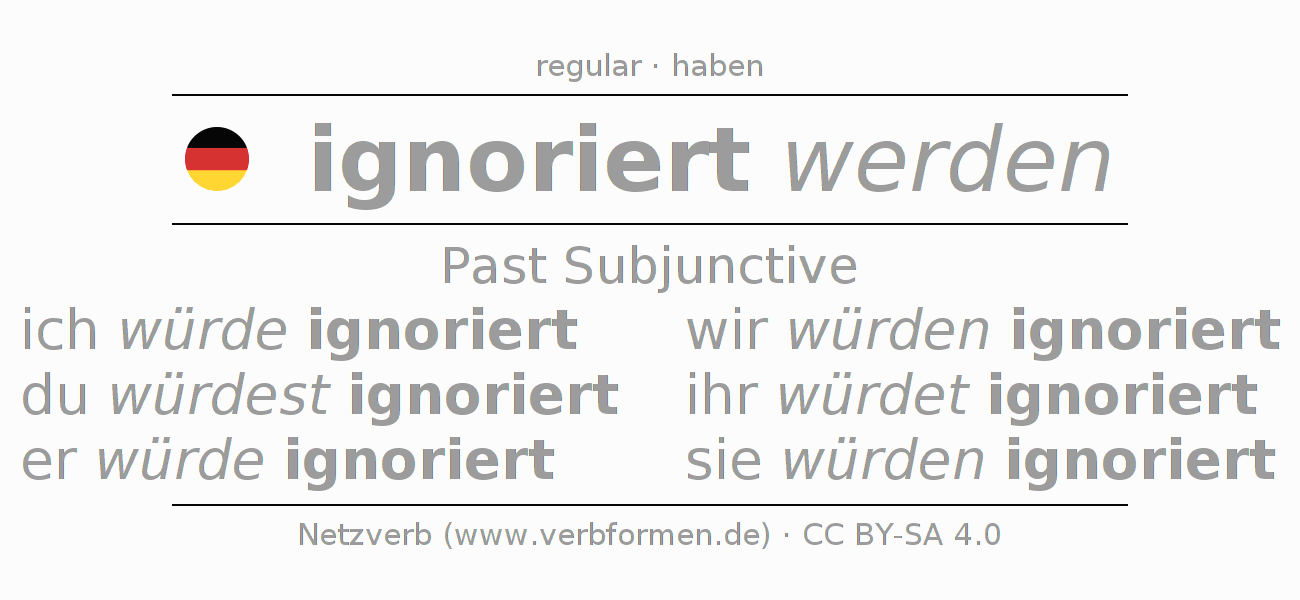 The conjugation of ignorieren in Subjunctive Imperfect Form of possibility Passive is ich würde ignoriert, du würdest ignoriert, er würde ignoriert, wir würden ignoriert, ihr würdet ignoriert, sie würden ignoriert.The conjugation corresponds to certain grammatical rules. Likewise the requirements for the conjugation of the simple verb forms of ignorieren in Imperfect Subjunctive. Comments ☆