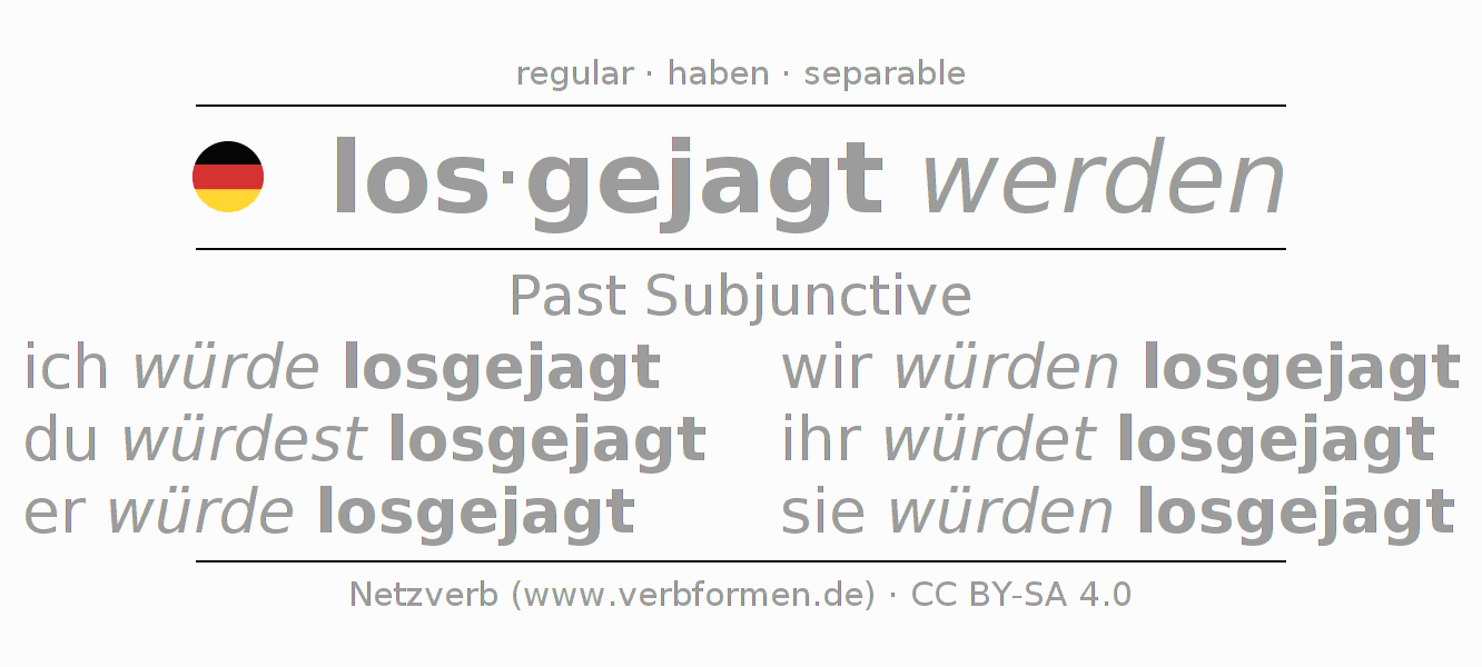 The conjugation of losjagen in Subjunctive Imperfect Form of possibility Passive is ich würde losgejagt, du würdest losgejagt, er würde losgejagt, wir würden losgejagt, ihr würdet losgejagt, sie würden losgejagt.The conjugation corresponds to certain grammatical rules. Likewise the requirements for the conjugation of the simple verb forms of losjagen in Imperfect Subjunctive. Comments ☆