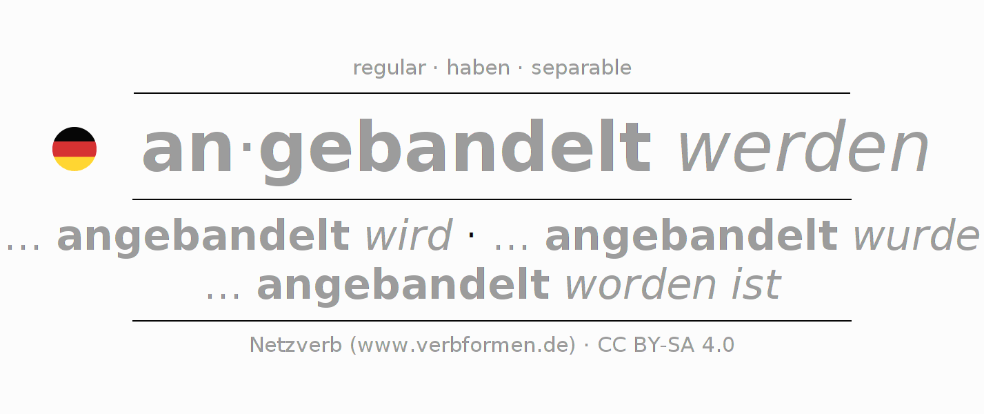 The conjugation of anbandeln in Subjunctive Imperfect Form of possibility Passive is ... ich angebandelt würde, ... du angebandelt würdest, ... er angebandelt würde, ... wir angebandelt würden, ... ihr angebandelt würdet, ... sie angebandelt würden.The conjugation corresponds to certain grammatical rules. Likewise the requirements for the conjugation of the simple verb forms of anbandeln in Imperfect Subjunctive. Comments ☆