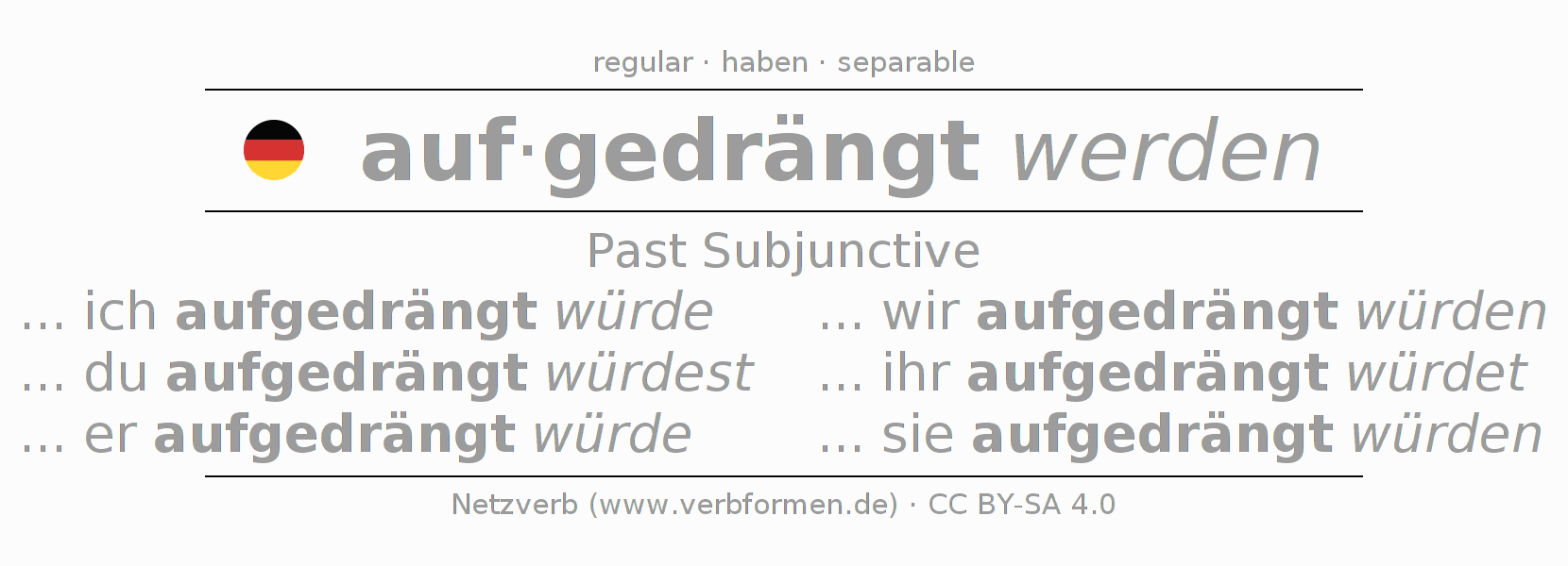The conjugation of aufdrängen in Subjunctive Imperfect Form of possibility Passive is ... ich aufgedrängt würde, ... du aufgedrängt würdest, ... er aufgedrängt würde, ... wir aufgedrängt würden, ... ihr aufgedrängt würdet, ... sie aufgedrängt würden.The conjugation corresponds to certain grammatical rules. Likewise the requirements for the conjugation of the simple verb forms of aufdrängen in Imperfect Subjunctive. Comments ☆