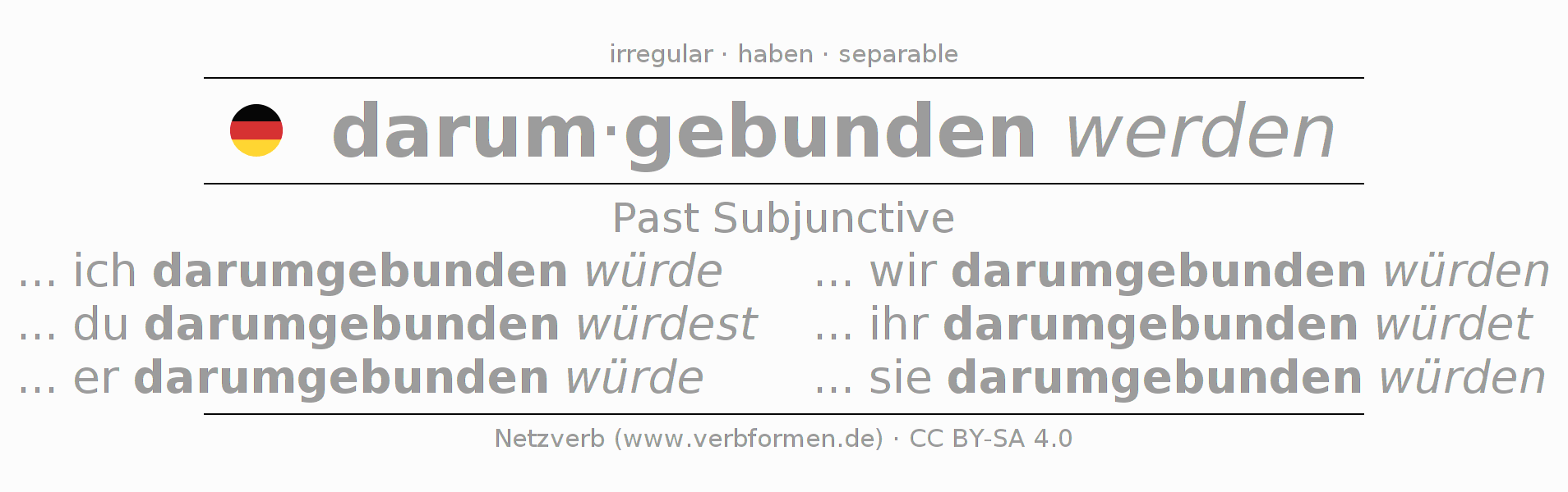 The conjugation of darumbinden in Subjunctive Imperfect Form of possibility Passive is ... ich darumgebunden würde, ... du darumgebunden würdest, ... er darumgebunden würde, ... wir darumgebunden würden, ... ihr darumgebunden würdet, ... sie darumgebunden würden.The conjugation corresponds to certain grammatical rules. Likewise the requirements for the conjugation of the simple verb forms of darumbinden in Imperfect Subjunctive. Comments ☆
