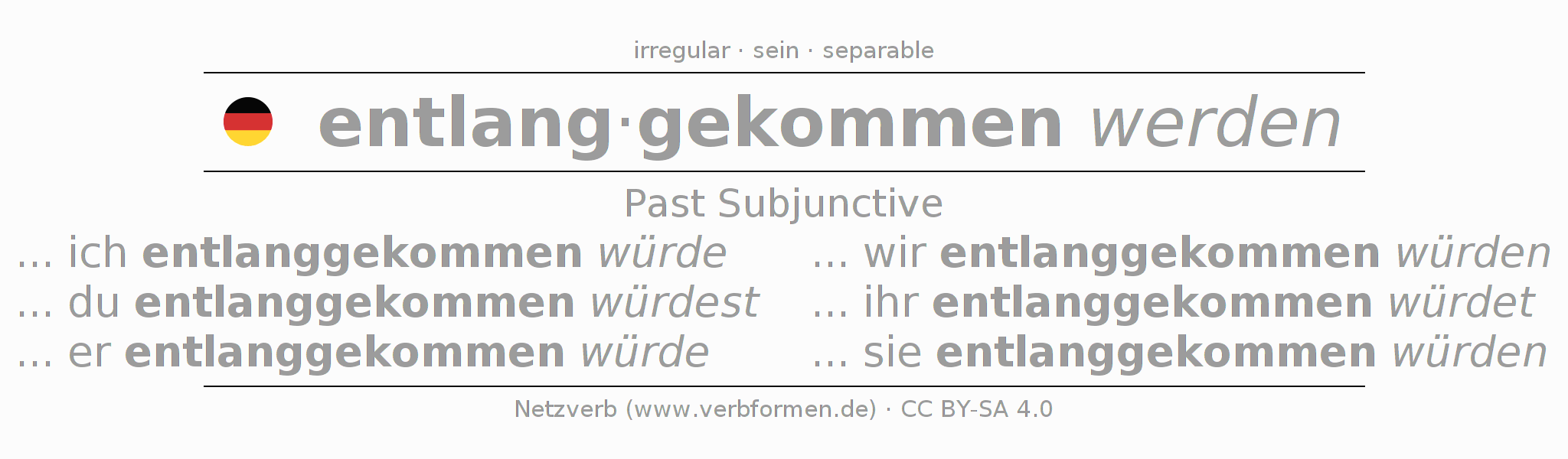 The conjugation of entlangkommen in Subjunctive Imperfect Form of possibility Passive is ... ich entlanggekommen würde, ... du entlanggekommen würdest, ... er entlanggekommen würde, ... wir entlanggekommen würden, ... ihr entlanggekommen würdet, ... sie entlanggekommen würden.The conjugation corresponds to certain grammatical rules. Likewise the requirements for the conjugation of the simple verb forms of entlangkommen in Imperfect Subjunctive. Comments ☆