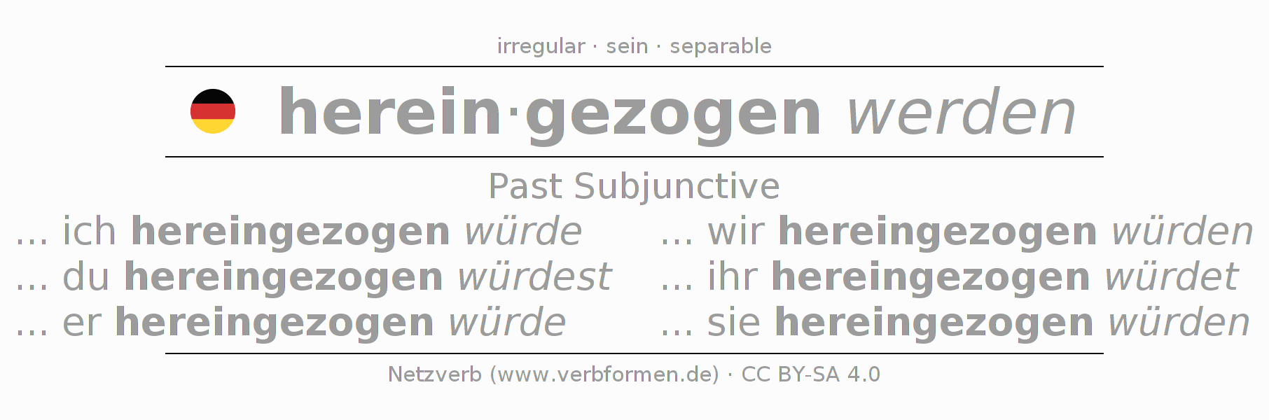The conjugation of hereinziehen in Subjunctive Imperfect Form of possibility Passive is ... ich hereingezogen würde, ... du hereingezogen würdest, ... er hereingezogen würde, ... wir hereingezogen würden, ... ihr hereingezogen würdet, ... sie hereingezogen würden.The conjugation corresponds to certain grammatical rules. Likewise the requirements for the conjugation of the simple verb forms of hereinziehen in Imperfect Subjunctive. Comments ☆