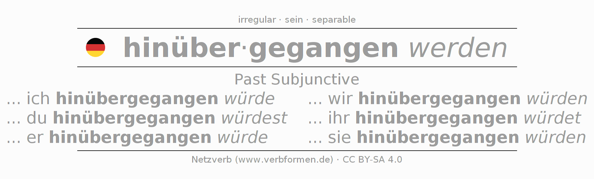 The conjugation of hinübergehen in Subjunctive Imperfect Form of possibility Passive is ... ich hinübergegangen würde, ... du hinübergegangen würdest, ... er hinübergegangen würde, ... wir hinübergegangen würden, ... ihr hinübergegangen würdet, ... sie hinübergegangen würden.The conjugation corresponds to certain grammatical rules. Likewise the requirements for the conjugation of the simple verb forms of hinübergehen in Imperfect Subjunctive. Comments ☆