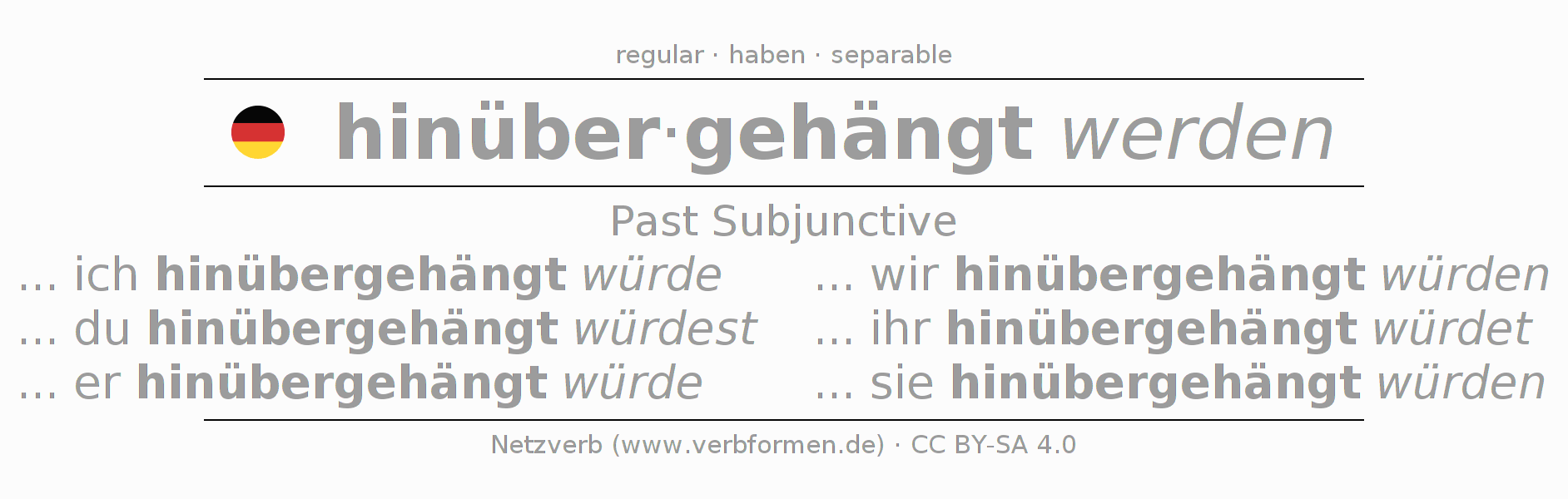 The conjugation of hinüberhängen in Subjunctive Imperfect Form of possibility Passive is ... ich hinübergehängt würde, ... du hinübergehängt würdest, ... er hinübergehängt würde, ... wir hinübergehängt würden, ... ihr hinübergehängt würdet, ... sie hinübergehängt würden.The conjugation corresponds to certain grammatical rules. Likewise the requirements for the conjugation of the simple verb forms of hinüberhängen in Imperfect Subjunctive. Comments ☆