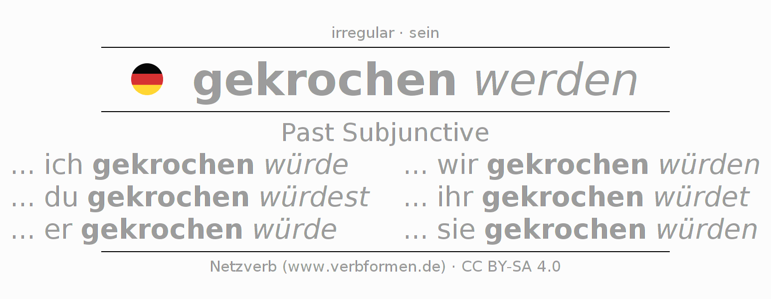 The conjugation of krauchen in Subjunctive Imperfect Form of possibility Passive is ... ich gekrochen würde, ... du gekrochen würdest, ... er gekrochen würde, ... wir gekrochen würden, ... ihr gekrochen würdet, ... sie gekrochen würden.The conjugation corresponds to certain grammatical rules. Likewise the requirements for the conjugation of the simple verb forms of krauchen in Imperfect Subjunctive. Comments ☆