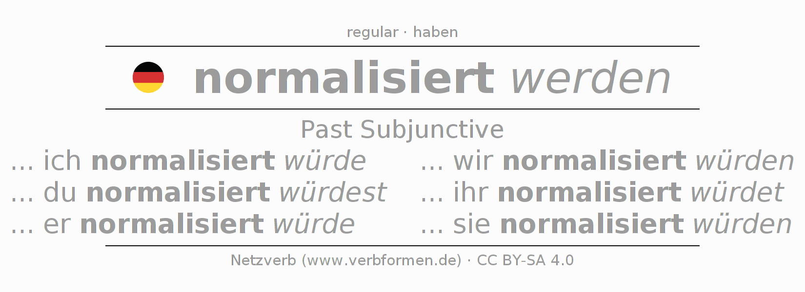 The conjugation of normalisieren in Subjunctive Imperfect Form of possibility Passive is ... ich normalisiert würde, ... du normalisiert würdest, ... er normalisiert würde, ... wir normalisiert würden, ... ihr normalisiert würdet, ... sie normalisiert würden.The conjugation corresponds to certain grammatical rules. Likewise the requirements for the conjugation of the simple verb forms of normalisieren in Imperfect Subjunctive. Comments ☆