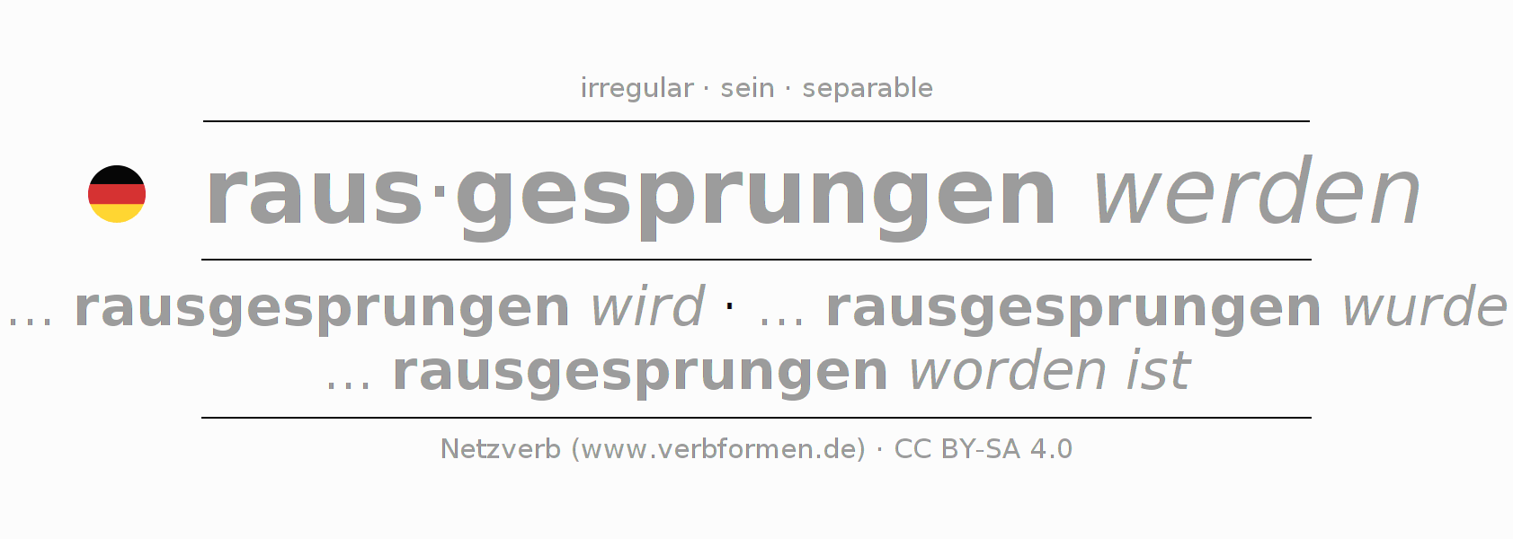 The conjugation of rausspringen in Subjunctive Imperfect Form of possibility Passive is ... ich rausgesprungen würde, ... du rausgesprungen würdest, ... er rausgesprungen würde, ... wir rausgesprungen würden, ... ihr rausgesprungen würdet, ... sie rausgesprungen würden.The conjugation corresponds to certain grammatical rules. Likewise the requirements for the conjugation of the simple verb forms of rausspringen in Imperfect Subjunctive. Comments ☆