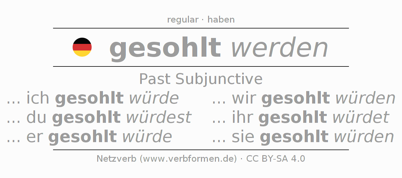 The conjugation of sohlen in Subjunctive Imperfect Form of possibility Passive is ... ich gesohlt würde, ... du gesohlt würdest, ... er gesohlt würde, ... wir gesohlt würden, ... ihr gesohlt würdet, ... sie gesohlt würden.The conjugation corresponds to certain grammatical rules. Likewise the requirements for the conjugation of the simple verb forms of sohlen in Imperfect Subjunctive. Comments ☆