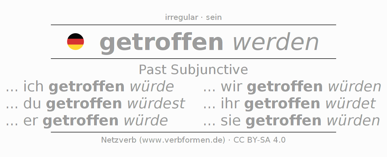 The conjugation of treffen in Subjunctive Imperfect Form of possibility Passive is ... ich getroffen würde, ... du getroffen würdest, ... er getroffen würde, ... wir getroffen würden, ... ihr getroffen würdet, ... sie getroffen würden.The conjugation corresponds to certain grammatical rules. Likewise the requirements for the conjugation of the simple verb forms of treffen in Imperfect Subjunctive. Comments ☆