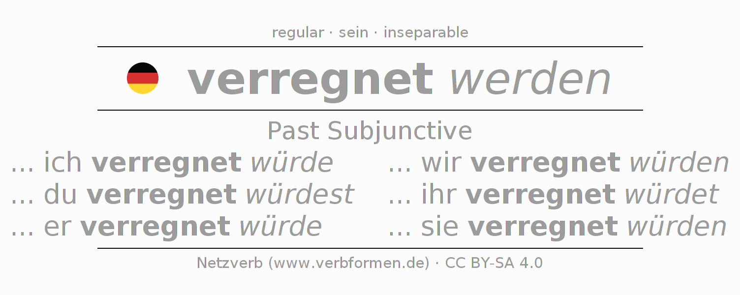 The conjugation of verregnen in Subjunctive Imperfect Form of possibility Passive is ... ich verregnet würde, ... du verregnet würdest, ... er verregnet würde, ... wir verregnet würden, ... ihr verregnet würdet, ... sie verregnet würden.The conjugation corresponds to certain grammatical rules. Likewise the requirements for the conjugation of the simple verb forms of verregnen in Imperfect Subjunctive. Comments ☆