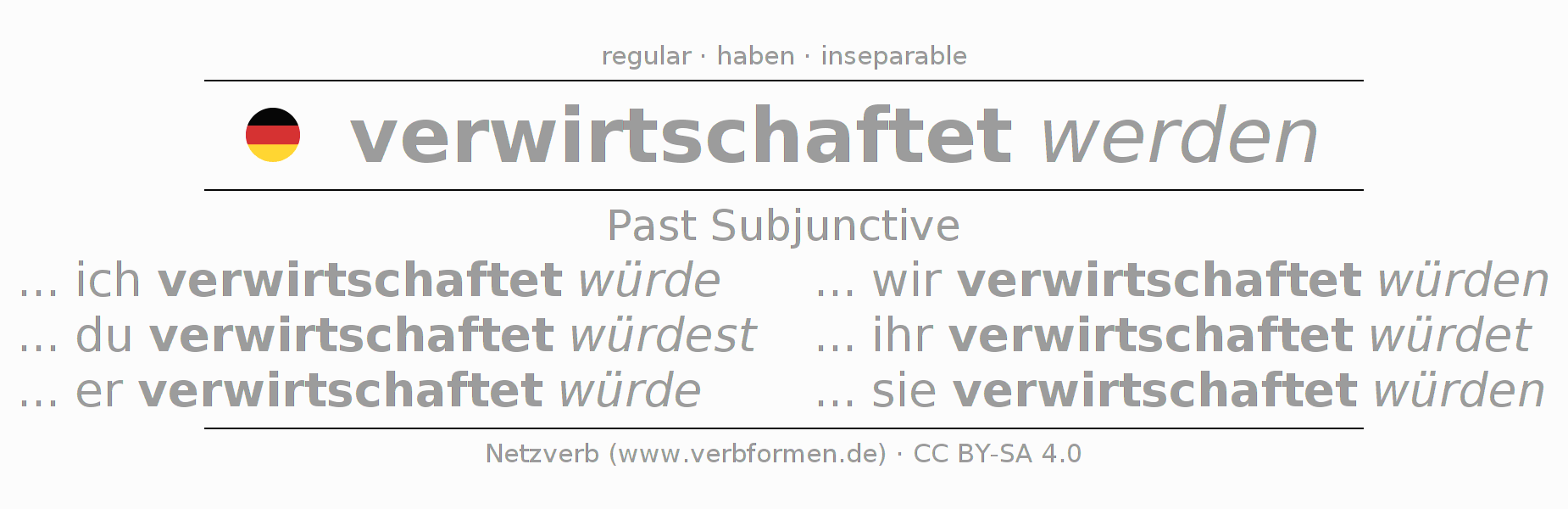 The conjugation of verwirtschaften in Subjunctive Imperfect Form of possibility Passive is ... ich verwirtschaftet würde, ... du verwirtschaftet würdest, ... er verwirtschaftet würde, ... wir verwirtschaftet würden, ... ihr verwirtschaftet würdet, ... sie verwirtschaftet würden.The conjugation corresponds to certain grammatical rules. Likewise the requirements for the conjugation of the simple verb forms of verwirtschaften in Imperfect Subjunctive. Comments ☆