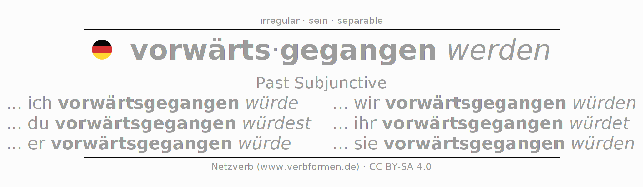 The conjugation of vorwärtsgehen in Subjunctive Imperfect Form of possibility Passive is ... ich vorwärtsgegangen würde, ... du vorwärtsgegangen würdest, ... er vorwärtsgegangen würde, ... wir vorwärtsgegangen würden, ... ihr vorwärtsgegangen würdet, ... sie vorwärtsgegangen würden.The conjugation corresponds to certain grammatical rules. Likewise the requirements for the conjugation of the simple verb forms of vorwärtsgehen in Imperfect Subjunctive. Comments ☆