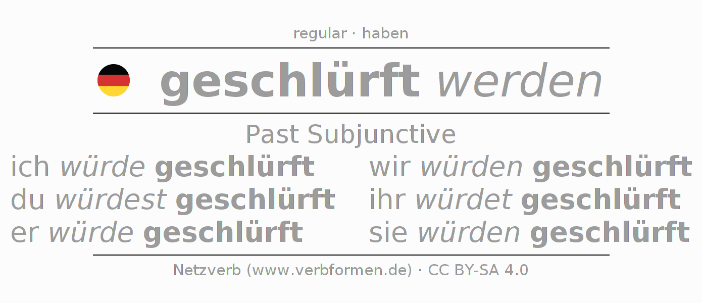 The conjugation of schlürfen in Subjunctive Imperfect Form of possibility Passive is ich würde geschlürft, du würdest geschlürft, er würde geschlürft, wir würden geschlürft, ihr würdet geschlürft, sie würden geschlürft.The conjugation corresponds to certain grammatical rules. Likewise the requirements for the conjugation of the simple verb forms of schlürfen in Imperfect Subjunctive. Comments ☆