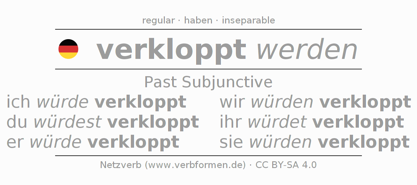 The conjugation of verkloppen in Subjunctive Imperfect Form of possibility Passive is ich würde verkloppt, du würdest verkloppt, er würde verkloppt, wir würden verkloppt, ihr würdet verkloppt, sie würden verkloppt.The conjugation corresponds to certain grammatical rules. Likewise the requirements for the conjugation of the simple verb forms of verkloppen in Imperfect Subjunctive. Comments ☆