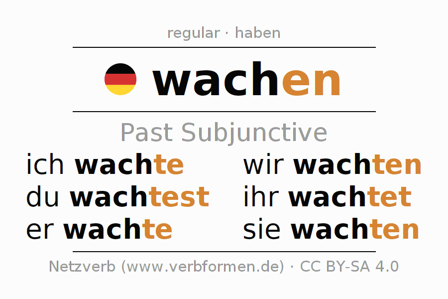 The conjugation of wachen (wake, guard) in subjunctive II is: ich wachte, du wachtest, er wachte, wir wachten, ihr wachtet, sie wachten. As a regular verb the unmodified stem wach is used. The subjunctive endings -te, -test, -te, -ten, -tet, -ten are appended to this stem. The conjugation of these forms conforms to the grammatical rules for verbs in the subjunctive II tense.