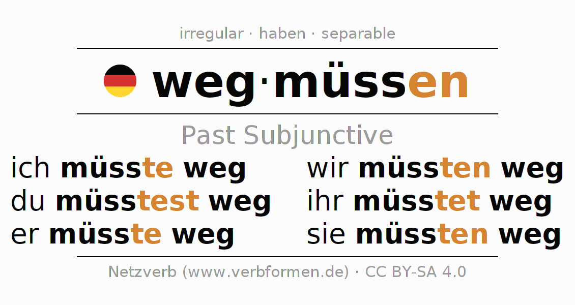 The conjugation of wegmüssen (must go away, have to leave) in subjunctive II is: ich müsste weg, du müsstest weg, er müsste weg, wir müssten weg, ihr müsstet weg, sie müssten weg. As an irregular verb is the changed subjunctive stem müss- used. The subjunctive endings -te, -test, -te, -ten, -tet, -ten are appended to this stem. The prefix weg- of wegmüssen is separated. The conjugation of these forms conforms to the grammatical rules for verbs in the subjunctive II tense.