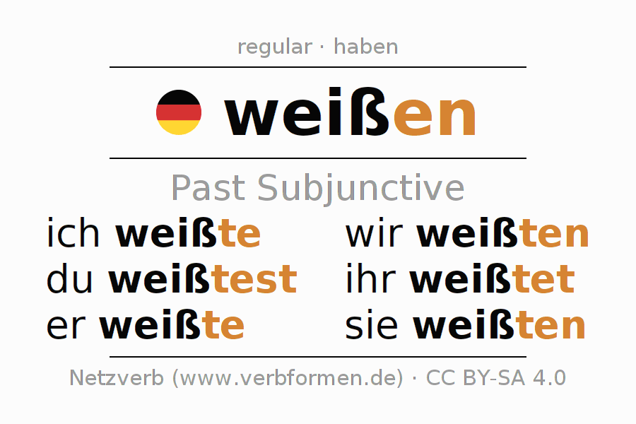 The conjugation of weißen (chalk, know) in subjunctive II is: ich weißte, du weißtest, er weißte, wir weißten, ihr weißtet, sie weißten. As a regular verb the unmodified stem weiß is used. The subjunctive endings -te, -test, -te, -ten, -tet, -ten are appended to this stem. The conjugation of these forms conforms to the grammatical rules for verbs in the subjunctive II tense.