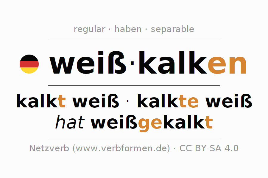 The conjugation of weißkalken (whitewash) in subjunctive II is: ich kalkte weiß, du kalktest weiß, er kalkte weiß, wir kalkten weiß, ihr kalktet weiß, sie kalkten weiß. As a regular verb the unmodified stem kalk is used. The subjunctive endings -te, -test, -te, -ten, -tet, -ten are appended to this stem. The prefix weiß- of weißkalken is separated. The conjugation of these forms conforms to the grammatical rules for verbs in the subjunctive II tense.