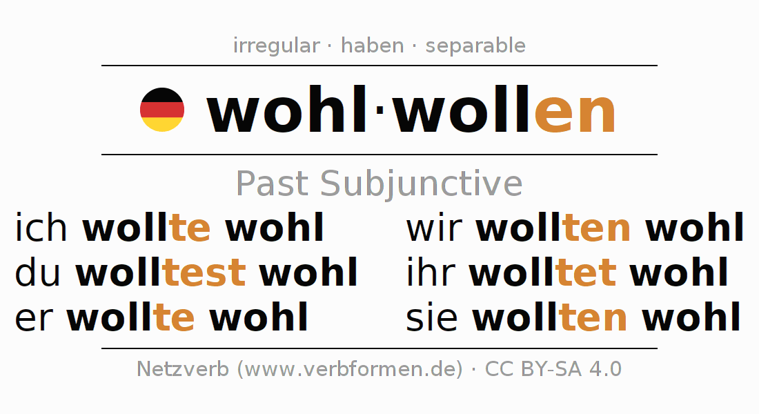 The conjugation of wohlwollen (wish someone well, wish well) in subjunctive II is: ich wollte wohl, du wolltest wohl, er wollte wohl, wir wollten wohl, ihr wolltet wohl, sie wollten wohl. As an irregular verb is the changed subjunctive stem woll- used. The subjunctive endings -te, -test, -te, -ten, -tet, -ten are appended to this stem. The prefix wohl- of wohlwollen is separated. The conjugation of these forms conforms to the grammatical rules for verbs in the subjunctive II tense.