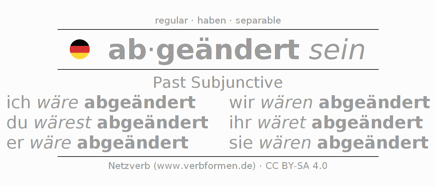 The conjugation of abändern in Subjunctive Imperfect Form of possibility Statal Passive is ich wäre abgeändert, du wärest abgeändert, er wäre abgeändert, wir wären abgeändert, ihr wäret abgeändert, sie wären abgeändert.The conjugation corresponds to certain grammatical rules. Likewise the requirements for the conjugation of the simple verb forms of abändern in Imperfect Subjunctive. Comments ☆