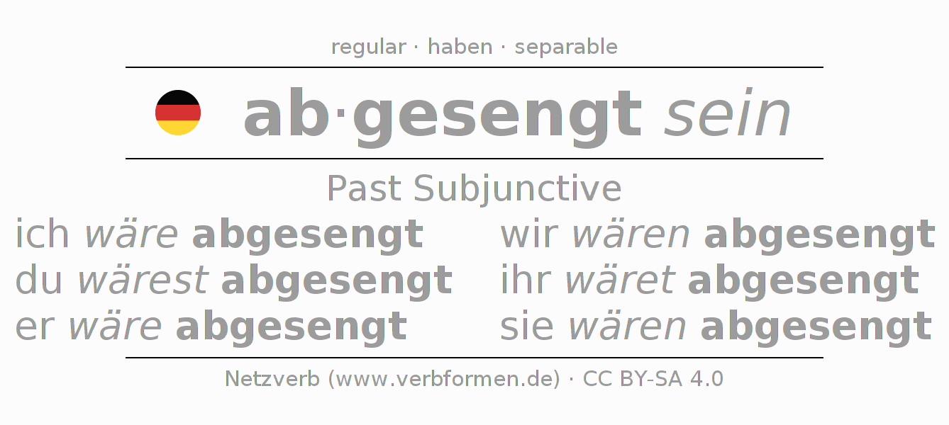 The conjugation of absengen in Subjunctive Imperfect Form of possibility Statal Passive is ich wäre abgesengt, du wärest abgesengt, er wäre abgesengt, wir wären abgesengt, ihr wäret abgesengt, sie wären abgesengt.The conjugation corresponds to certain grammatical rules. Likewise the requirements for the conjugation of the simple verb forms of absengen in Imperfect Subjunctive. Comments ☆