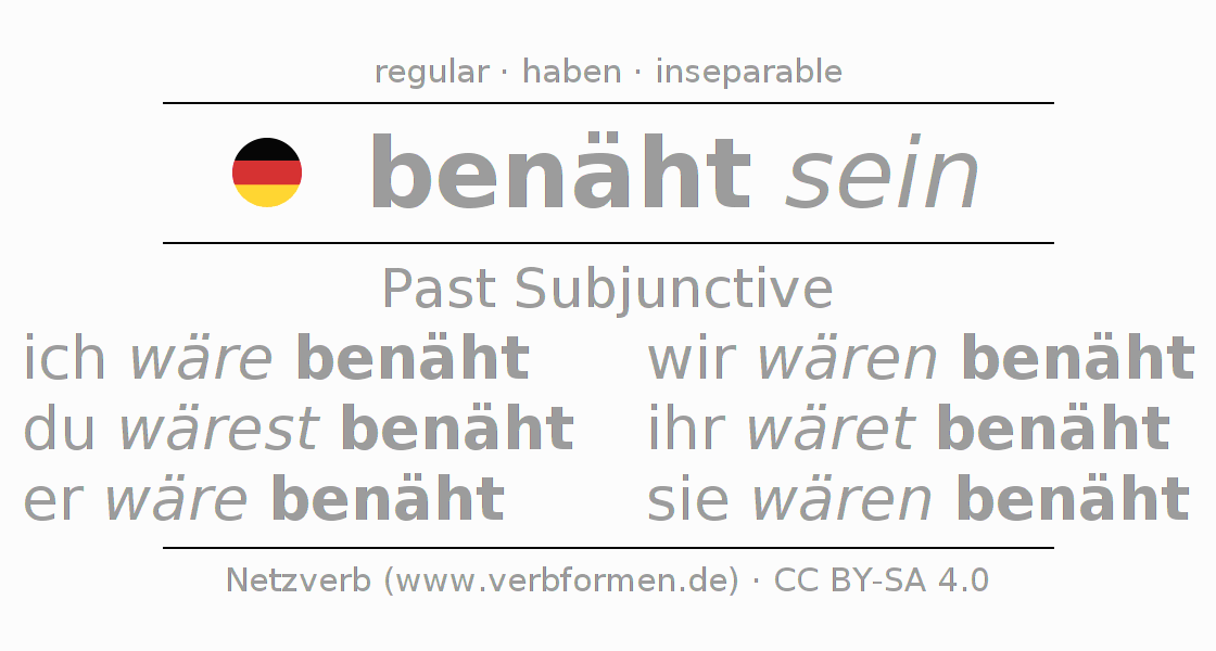 The conjugation of benähen in Subjunctive Imperfect Form of possibility Statal Passive is ich wäre benäht, du wärest benäht, er wäre benäht, wir wären benäht, ihr wäret benäht, sie wären benäht.The conjugation corresponds to certain grammatical rules. Likewise the requirements for the conjugation of the simple verb forms of benähen in Imperfect Subjunctive. Comments ☆