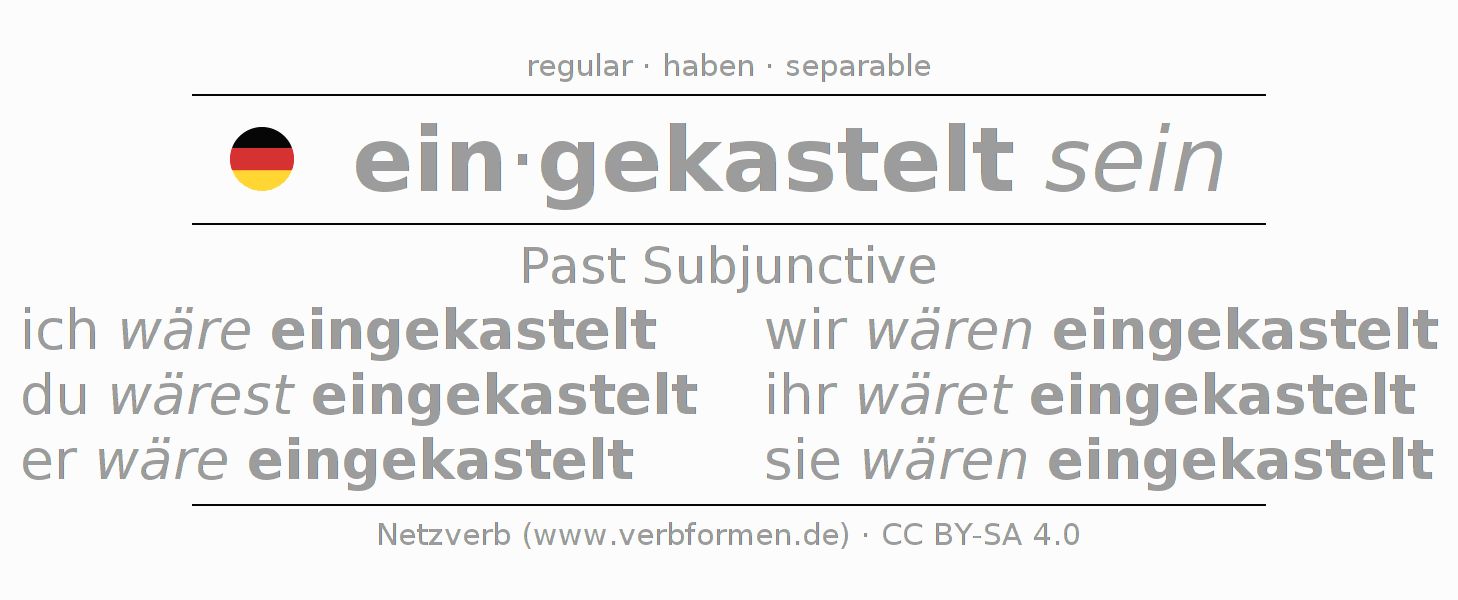 The conjugation of einkasteln in Subjunctive Imperfect Form of possibility Statal Passive is ich wäre eingekastelt, du wärest eingekastelt, er wäre eingekastelt, wir wären eingekastelt, ihr wäret eingekastelt, sie wären eingekastelt.The conjugation corresponds to certain grammatical rules. Likewise the requirements for the conjugation of the simple verb forms of einkasteln in Imperfect Subjunctive. Comments ☆